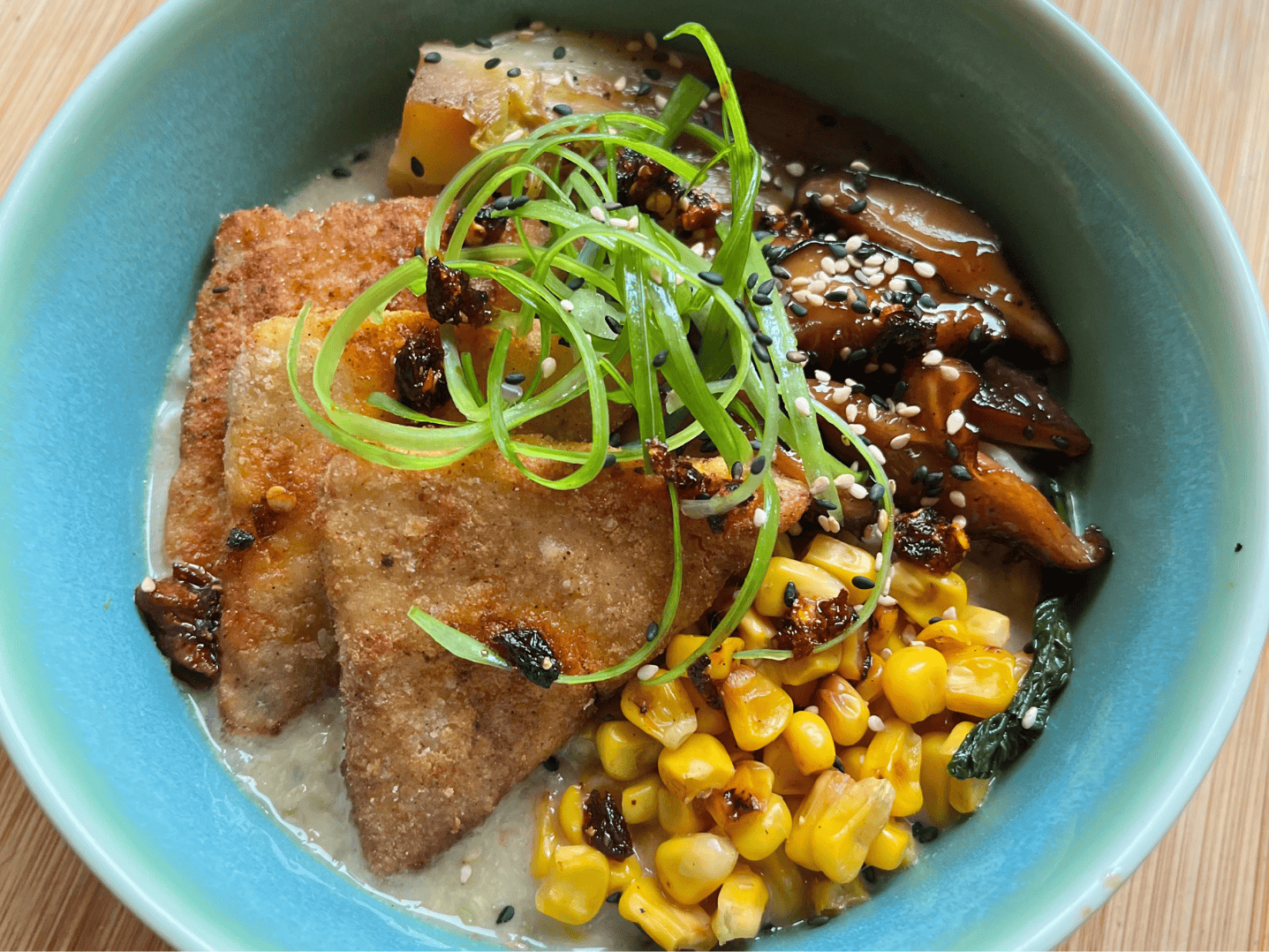Next cook the toppings. Char the corn in a frying pan on medium-high heat. Once it has some colour, remove from the pan and set aside. On a medium heat, fry the mushrooms in a little sesame oil. Once cooked, remove from the heat, add the vegetarian oyster sauce and agave, remove from pan and set aside.